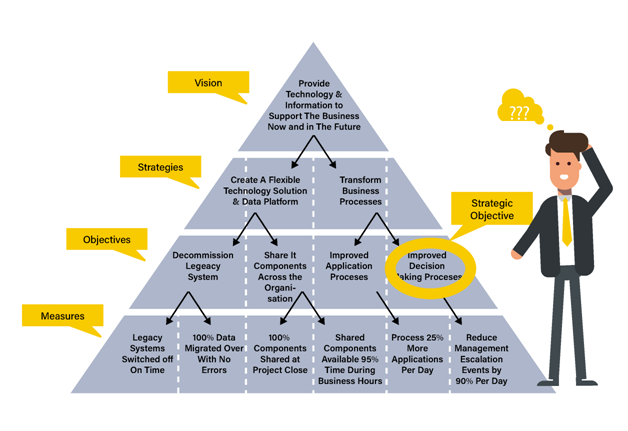 The very first thing you do using our framework, HOBA® is to implement the Business Motivation Model (BMM). The BMM allows you towork with the team and agree on “what the end looks like” for the project and your transformation. This gets everyone across the organization clear on what the end looks like – which is also the number 1 requirement on any transformation – and that’s the Vision (download our free template here)!